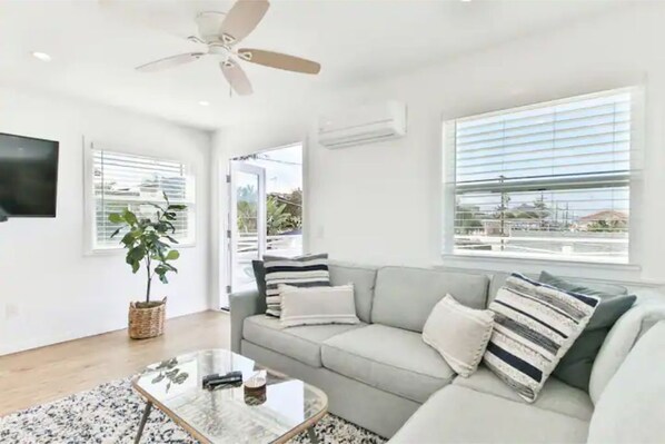 The Blue Whale Beach House is a completely private 2-story guest house with a fenced-in front yard, private entrance, and upstairs patio with both ocean and bay views so you can enjoy having your meals and drinks outside! On the first floor is a large bedroom with 2 queen-size beds, 2 closets providing plenty of storage, full-size washer and dryer, and full bath. Upstairs is a light and airy open floor plan space with a kitchen, balcony, and living room with a large flat screen TV with cable. The interior space is 800sq ft.