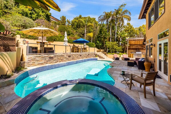 The main event of the property is the immaculately landscaped backyard, complete with comfortable patio furniture, lounge chairs, a dedicated barbecue patio, an outdoor fireplace, and a sparkling pool with an enclosed hot tub. There's even a wood playhouse for the little ones to explore! With no shortage of things to do and a home where you'll want for nothing, you'll have the California getaway of your dreams.