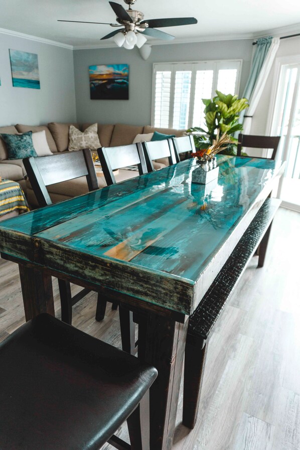 Unser Wohnzimmer verfügt über ein brandneues Designer-Sofa mit einer riesigen Ottomane, die das Sofa in ein Queen-Size-Bett verwandeln kann. Das Wohnzimmer und der Rest der zweiten Etage sind mit luxuriösen Dielenböden und LED-Beleuchtung ausgestattet. Neben dem Wohnzimmer befindet sich der Essbereich mit einem maßgefertigten Showstopper-Tisch, der künstlerisch aus wiederverwertetem Holz und türkisfarbenem Epoxidharz gefertigt ist, sowie eine neu installierte Glasschiebetür, die sich vollständig zum Balkon hin öffnet und den Raum mit Licht durchflutet.