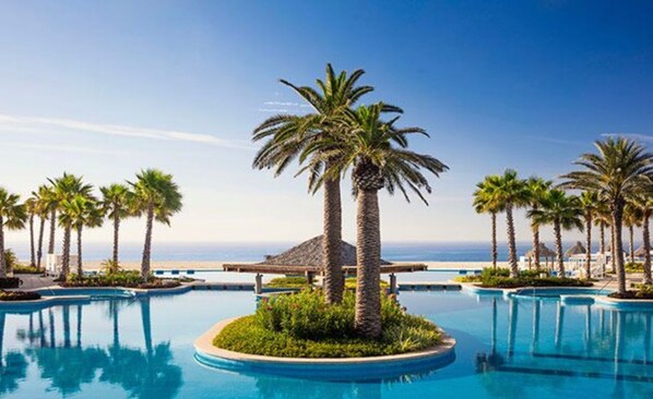 From the moment you set foot at Vidanta Los Cabos, you know you've arrived in a world of luxury. The arresting ringed tunnel entrance announces a different approach to beach vacationing, one that's on the forefront of dining, entertainment, and architecture trends. Welcome to the completely transformed Los Cabos. The Master Room features a king-size bed, one bathroom with Jacuzzi tub, a TV, and a private terrace with a view.