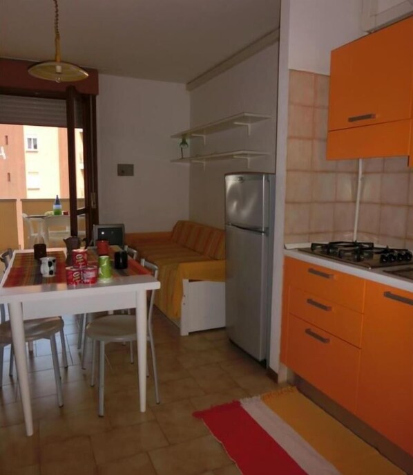 Die gut eingerichtete Küche verfügt über Herd, Geschirr, Besteck, Töpfe, und einen Kühlschrank mit Eisfach. Wer nicht selbst kochen möchte, kann eines der vielen Restaurants in Fussnähe besuchen und sich von der guten italienischen Küche verwöhnen lassen.