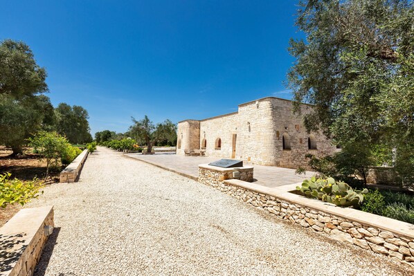 In the garden, in addition to the big swimming pool with hydromassage area, there are an ancient trullo, a large solarium area with beach beds, sofas and benches, a barbecue area and a beautiful wooden porch with dining area.