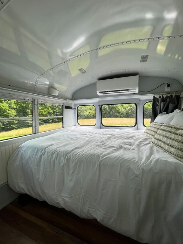 – Unique & Memorable Stay in the MountainsWe had such a memorable trip here! The kitchen was great to cook in, the two AC units (front and back) kept us cool, and the back bedroom was super comfy. I slept great and felt safe the whole time.There are definitely some quirks to be aware of:The patio curtain wasn’t installed quite right — we adjusted it ourselves, but it was still nice to sip my morning coffee out there.There’s no indoor shower — we brought our own shower tent, which ended up being magical to use under the moonlight, but you’ll need to plan ahead if you want that option.The key lockbox was a little tricky, and locking the bus took a minute to figure out.Parking was tight and close to another bus, so maneuvering felt a bit intrusive.Bring your own coffee, condiments, and extras – amenities were pretty minimal (though a flyswatter, air freshener, and maybe some scent plugs inside would be a nice touch).Curtains or blinds would make it feel more private.We couldn’t figure out the TV mount (it’s a remote system).That said, the location and experience were unforgettable. We drove up through gorgeous scenery, reconnected with family, and even saw a bear! This is a place for travelers who embrace adventure and don’t mind a few quirks in exchange for a unique stay.