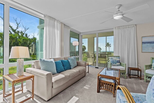 Step into your dream beach escape in this freshly renovated Gulf-front retreat. Island Beach Club is the the closest condominium complex to the beach in all of Sanibel. From the moment you walk in, you'll be greeted by sunlit interiors and stunning ocean views through an expansive wall of windows in the main living area. Light, airy sheers add a touch of sophistication while framing breathtaking views of the Gulf from the kitchen, living room, and private patio.