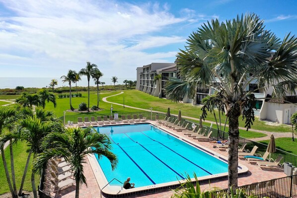 Condo amenities include: 2 bedrooms/2 bathrooms -- 1 King bed, 1 Queen bed, 2 Twin (bunk) beds & 1 pull-out sleeper sofa with memory foam mattress (sleeps 6), 3 Smart TVs (streaming only), WIFI available, fully equipped kitchen, computer & printer, heated shared pool, in-suite washer & dryer, public BBQ gas grills, shuffleboard, community tennis courts, elevator access. Bed linens and Bath towels included. No Pets allowed. This unit comes stocked with beach chairs, beach towels and an umbrella.
