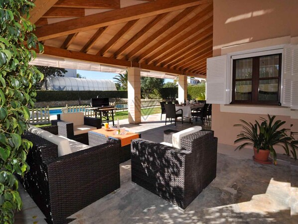 Der Garten verfügt außerdem über eine großzügige, möblierte Veranda, ideal zum Entspannen oder für Mahlzeiten im Freien, sowie über ein Außenbad mit Dusche.