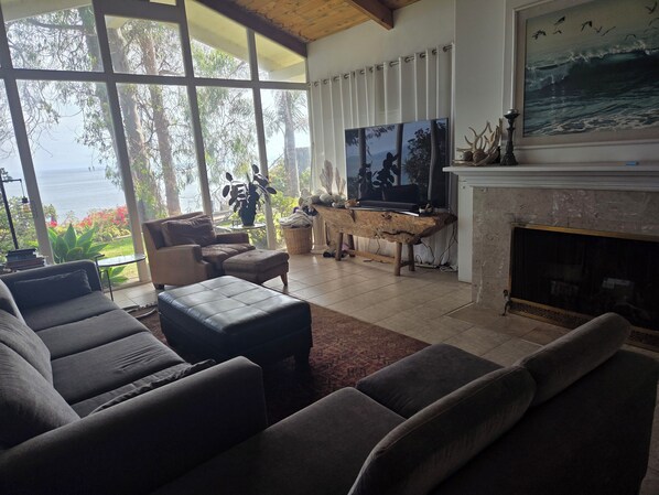 It is a great property for entertainment. The home has three great decks, one cozy protected deck, under the home roof with a large gas fireplace, a bluff side deck with spectacular panoramic views and a space heater, another east facing deck has great beach views, perfect for sunrise morning yoga or just morning coffee. All have teak chairs. Very, very common to see dolphins of all types, brown pelicans with a wingspan of over 6.5 feet, and sea otters. You can see gray whales, blue whales, and humpback whales, especially during specific seasons. Minke whales and fin whales are also occasionally spotted.