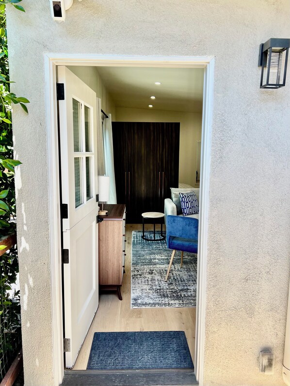 New, fully furnished studio guesthouse for one occupant, near Cottage Hospital offers the perfect retreat for those seeking privacy and tranquility. Quiet location offers comfort and convenience. Sleeping area with queen bed. Full kitchen with induction range, all major appliances and necessary kitchenware. Luxurious bathroom with shower. Unit opens onto large, private, sunny patio and includes exclusive-use adjacent laundry and storage room.