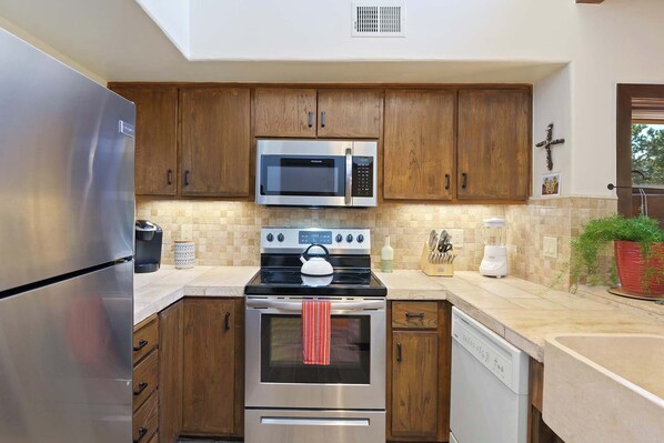 The fully-equipped and newly-renovated kitchen and dining area are elevated above the living room, and offer a fantastic space for your group to socialize, cook, and dine at home.
