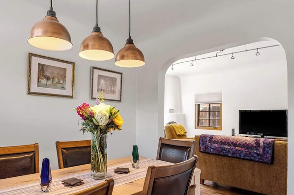 Casa O'Keeffe welcomes you with stunning natural light from the arched window in the living room. The inviting furniture, and tasteful decoration add to the home's Southwestern flavor and relaxing atmosphere.