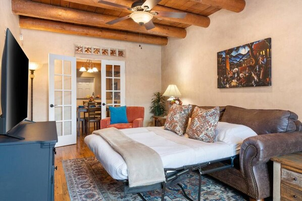 The living room, with its queen size sleeper sofa, serves as additional bedroom space for larger groups.