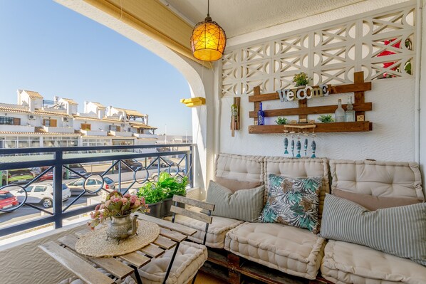 Vom Wohnzimmer gelangen Sie auf den Balkon und über eine Treppe auf die 40 m² große, private Dachterrasse mit Gartenmöbeln und Grill – ideal für Frühstück in der Sonne, entspannte Nachmittage oder Abendessen im Freien, das ganze Jahr über dank des mediterranen Klimas.