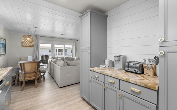 In dieser Wohnung in der obersten Etage finden neun Gäste Platz. Die Haupttür öffnet sich zum Balkon und ist ein schöner Ort, um die erste Tasse Kaffee des Tages zu genießen. Der Wohn- und Essbereich teilen sich diesen langen Balkon und lassen all die schöne Aussicht zu. Den Flur hinunter befinden sich das Queen-Zimmer, ein Gästezimmer mit zwei Einzelbetten und eine Wäscherei.