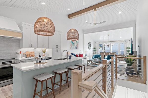 Inside, you'll be greeted by light-filled spaces, all-new coastal furnishings, and an open layout that invites you to relax and unwind. The kitchen comes fully stocked with stainless steel appliances, cookware, and everything you need for easy meals at home. The comfy living area is perfect for movie nights, lounging after beach days, or planning your next 30A adventure.