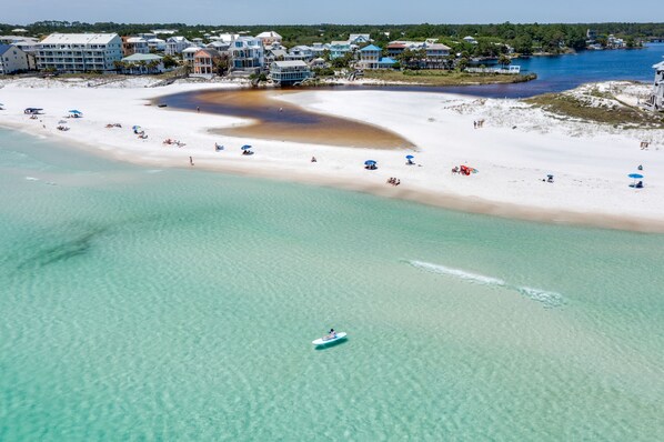 The house sits one block south of 30A itself and the famous Timpoochee Trail, a 19-mile bike path that runs along this scenic stretch of coastline. You'll be a quick, one-block stroll from an access point to the beach, where you can lounge on sugar-white sands and swim in the sparkling Gulf of Mexico at the spot where it meets Eastern Lake.