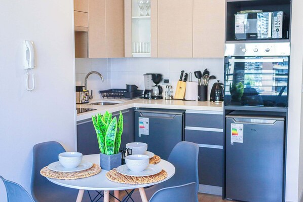 ✔️ Cocina equipada con refrigerador, cafetera y utensilios