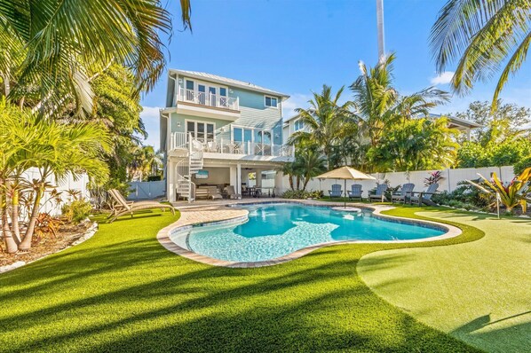 Coastal elegance describes this spectacular large family home. It's located in the heart of Anna Maria and is perfectly situated between the white sandy beaches and the Pine Avenue boutiques and restaurants. The open floor plan of this brand new home is professionally decorated and offers a spacious living area with a well-appointed kitchen and family room, 6 bedrooms (see bedroom configuration below) and 5½ bathrooms. The outdoor space of this beautiful home is just as luxurious and the inside! The huge back yard will easily accommodate family and friends and surpass all of your expectations. Golfing enthusiast will love the turf with built in putting green! The beautiful free form pool and lush garden provides a serene setting and privacy, and the generous patio area will allow you to fully enjoy the beautiful weather year round!