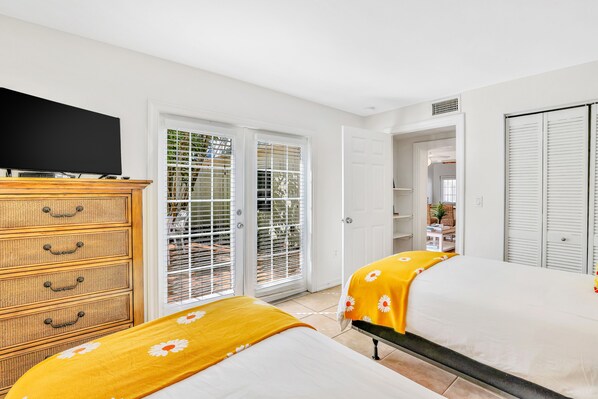 Colorful, cute cottage with nice private patio and lovely shared pool. Great location to bay & shops.