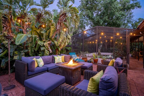 The owner is an educator in the healing arts and has designed the home for comfort, rejuvenation and shared experiences. Utilize the plethora of pottery, kitchen wares and linens for your meals at home. The open living plan offers plenty of seating for dining and lounging. There is ample space in this Florida bungalow to spend time together or grab a book off the shelf and cozy up for some much-needed alone time. Relax in the front courtyard with the chiminea at dusk and watch the birds. Enjoy the backyard heated pool and the covered patio with convenient dining and lounge areas. Unwind outside and use the BBQ, smoker and firepit to keep warm.