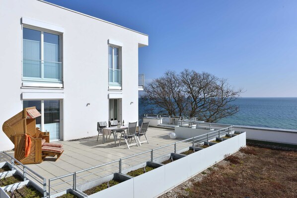 Ausstattung: Dachterrasse mit Gartenmöbeln und Strandkorb Küche mit Backofen, Mikrowelle, Spülmaschine, Kühlschrank mit Gefrierfach Sauna mit zusätzlichem Infrarotstrahler Radio, Flatscreen TV (2x), Blu-ray Player Gäste Bad mit Dusche Bad mit Wanne Fahrradstellplatz Parkplatz Münz-Waschmaschine und Trockner im Keller Aufzug WLAN