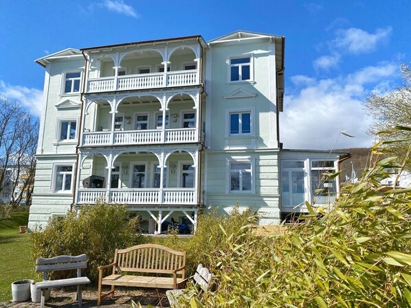 Die Villa Gössel, eine schön sanierte Bäderstil-Villa mit weißen Holzbalkonen, befindet sich in traumhafter Lage direkt am Hochufer von Sassnitz mit herrlichem Blick auf die Ostsee.