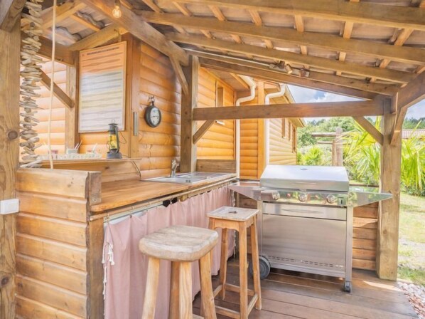 "Landais", 4-Zimmer-Chalet 50 m2. Komfortabel und schön eingerichtet: Wohn-/Esszimmer mit TV (Flachbildschirm). Ausgang zur Terrasse, Pergola. 1 Zimmer mit 1 franz. Bett (140 cm, Länge 190 cm), Dusche/WC. 1 Zimmer mit 1 franz. Bett (140 cm, Länge 190 cm). 1 Zimmer mit 1 Ausziehbett (2 Pers. 2 x 90 cm, Länge 190 cm). Offene Küche (Backofen, Geschirrspüler, 4 Induktionskochplatten, Toaster, Wasserkocher, Mikrowelle, elektrische Kaffeemaschine). Dusche, sep. WC. Keine Heizmöglichkeit. Terrasse 25 m2, 15 m2, Garten 400 m2. Terrassenmöbel. Zur Verfügung: Waschmaschine, Bügeleisen, Haartrockner. Internet (Wireless LAN, gratis). Parkplatz. Bitte beachten: Nichtraucher-Haus. Rauchmelder. 402912025-0002