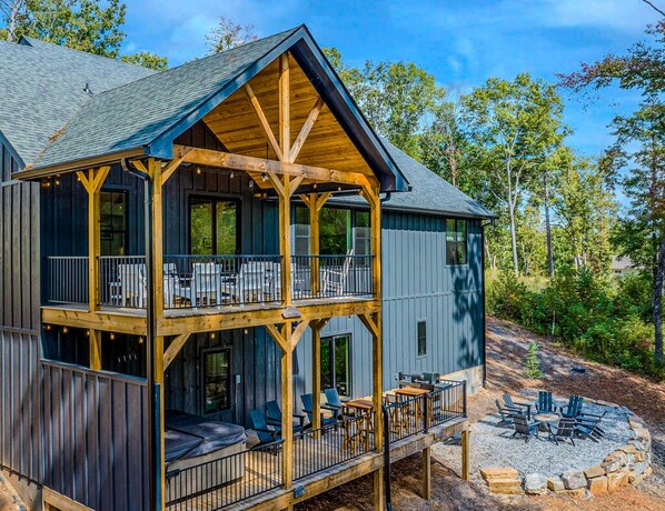 When it's time to unwind, step outside to your own private hot tub, sparkling with twinkling string lights. The deck leads down to a cozy patio with a gas fire pit and Adirondack chairs—perfect for evening chats under the stars.