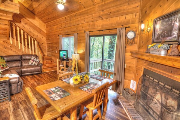 Eingebettet in den Wald finden Sie die Three Bears Cabin. Diese Kabine ist die perfekte Größe für jede Familie oder Freunde. Nehmen Sie sich Zeit und genießen Sie die umliegende Landschaft mit einem ruhigen Blick direkt vor den Glasschiebetüren, die sich direkt neben dem Wohnzimmer befinden. Oder Sie machen es sich am Kamin gemütlich und spielen mit Ihren Lieben Brettspiele. Wenn Sie Ihren Aufenthalt noch entspannter gestalten möchten, steigen Sie einfach in den Whirlpool auf dem Deck. Wenn es Zeit ist, ein Nickerchen zu machen, wählen Sie aus den 3 Schlafzimmern. Diese Hütte bietet 1 Schlafzimmer und ein Badezimmer im Erdgeschoss sowie 2 Schlafzimmer mit einem Badezimmer im Obergeschoss. Mach dir keine Sorgen über die Arbeit, denn diese Kabine hat Wifi. Drei Bären Kabine für 6 Personen mit der Option, 2 weitere auf dem ausziehbaren Schlafsofa zu schlafen. Also packen Sie Ihre Koffer, denn es ist Zeit, in dieser perfekten Kabine Urlaub zu machen.