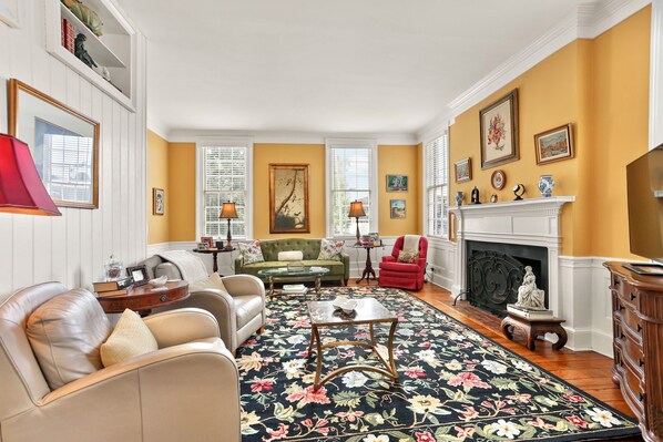 Here, you can experience history in one the city's oldest homes, circa 1806. Immerse yourself in the architecture & historic details, while enjoying all the modern comforts: updated bathrooms, smart TVs, a gourmet kitchen, Wi-Fi, a parking space steps from the front door & a gorgeous private courtyard complete with outdoor seating, bubbling fountain & vintage statue as your own personal oasis in the heart of the historic district.