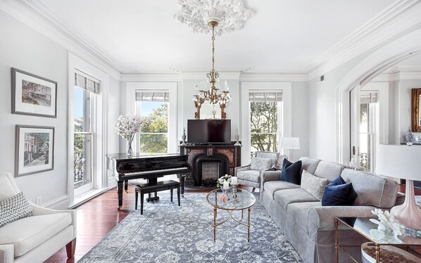Betreten Sie das Haupthaus im Erdgeschoss, wo Sie die voll ausgestattete Küche, eine gemütliche Frühstücksecke und ein großes, einladendes Schlafzimmer mit Kingsize-Bett finden. In der 2. Etage werden Sie von den makellosen Kranzleisten in den hellen und großen Salons begeistert sein. Ein formeller Speisesaal mit Sitzgelegenheiten für 6 Personen, der zum geschmackvoll eingerichteten Wohnzimmer offen ist, sorgt für Gemütlichkeit und Unterhaltung Ihrer Gäste. Im 3. Stock befinden sich 2 große Schlafzimmer, ein Master mit Kingsize-Bett und ein weiteres mit Queensize-Bett und Twin-Pull-Out-Stuhl. Die Gäste werden die luxuriösen Betten mit Bettwäsche in Hotelqualität und viel Stauraum genießen, um sich wie zu Hause zu fühlen. Ein eigenes Bad mit Doppelwaschtisch, einer Stehdusche und einer großen Badewanne befindet sich direkt neben dem Master.