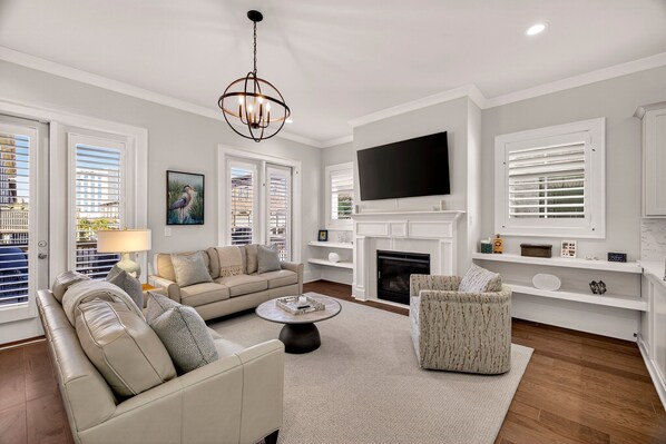 Incredible Open Floorplan: The second-floor living area is open, airy, and inviting. High ceilings and rich wood floors flow seamlessly through the living room, formal dining area, and chef’s kitchen — complete with a spacious island perfect for gathering. A cozy sectional and large smart TV create the ideal space to unwind after a day in the city, while the thoughtful layout makes entertaining effortless.