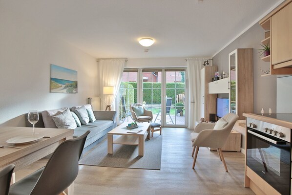 Die geschmackvoll eingerichtete 2-Zimmer Wohnung ist 45 m² groß und befindet sich im Erdgeschoss. Die Wohnung ist mit einem Vinylboden in Holzoptik ausgelegt. Das Wohnzimmer ist mit einem bequemen Schlafsofa (Liegefläche 1,50m x 2,0m), einem Flatscreen TV und einem Essplatz für 4 Personen ausgestattet. Die offen gestaltete Küche mit Kühlschrank, Backofen und Geschirrspüler rundet die komfortable Einrichtung ab. Von dort aus gelangen Sie auf die Südterrasse mit modernen Gartenmöbeln, wo Sie den Tag bei einem Glas Wein ausklingen lassen können.