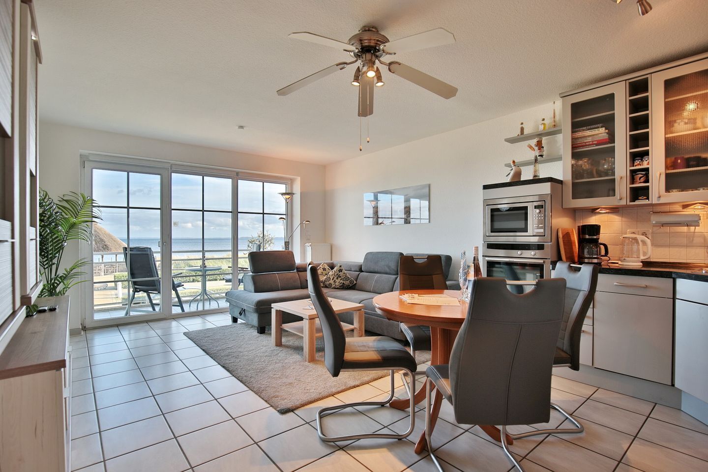 Die Wohnung liegt direkt gegenüber dem langen Sandstrand von Haffkrug und hat gleich 2 Balkonen mit Blick auf die Ostsee und die Neustädter Bucht. Sogar vom Bett aus können Sie das Meer sehen. Die 70 Quadratmeter große Wohnung hat bodentiefe Fenster, die Licht und Sonne hereinlassen. Die Wohnung ist komplett mit echtem Buchenholz im sogenannten ‚Schiffsboden-Parkett‘ ausgelegt. In der offenen Küche mit Tresen und hochwertiger Ausstattung fühlen sich Hobbyköche wohl und auch hier wieder: Kochen mit Seeblick !