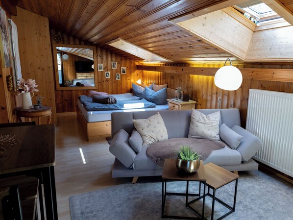 Unsere gemütliche Dachgeschosswohnung Magda verfügt über einen hellen Wohn-Schlafbereich, ein geräumiges Bad mit Dusche und eine praktische Küche. Von hier aus gelangen Sie auf den überdachten Balkon mit tollem Ausblick auf unseren Hausberg, den Grünstein. Vom Französischen Bett aus haben Sie durch das Dachfenster den besten Blick auf die Sterne. Die Küche ist mit einem Geschirrspüler, Mikrowelle, Ceranfeld, Kühlschrank, Kaffeemaschine, Wasserkocher und sämtlichen Küchenutensilien ausgestattet.