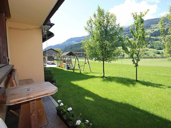 3-Zimmer-Wohnung 65 m2. Komfortabel und geschmackvoll eingerichtet: Eingang. Wohn-/Esszimmer mit Esstisch, Sat-TV, Radio und CD. Ausgang zum Garten. 1 Doppelzimmer. 1 Zimmer mit 1 Bett und 1 Doppelbett. Offene Küche (Backofen, Geschirrspüler, 4 Glaskeramikplatten, Mikrowelle). Dusche, sep. WC, Doppelwaschbecken. Gartensitzplatz. Terrassenmöbel. Sehr schöne Sicht auf die Berge und die Landschaft. Zur Verfügung: Internet (Wireless LAN, gratis). Bitte beachten: Nichtraucher-Unterkunft. Die Wohnung darf maximal mit 5 Personen belegt werden (inkusive Kinderbett).