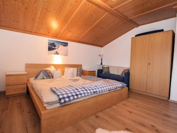 3-Zimmer-Wohnung 55 m2 im 2. Stock. Teilweise abgeschrägt, gemütlich eingerichtet: Eingang. 1 Zimmer mit 1 Diwanbett, 1 Doppelbett und Waschbecken. Ausgang zum Balkon. 1 Doppelzimmer mit Waschbecken. Ausgang zum Balkon. Wohnküche (Backofen, Geschirrspüler, 4 Glaskeramikplatten) mit Essecke und Sat-TV (Flachbildschirm), Radio. Dusche, sep. WC. Balkon, grosse Terrasse überdacht. Terrassenmöbel, Gartengrill, Liegestühle. Herrliche Panoramasicht auf die Berge und das Tal. Zur Verfügung: Internet (Wireless LAN, gratis). Bitte beachten: eigener Eingang.