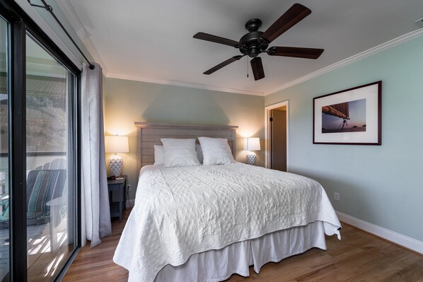 Das Schlafzimmer verfügt über ein französisches Bett, ein eigenes Bad und Zugang zum abgeschirmten Veranda. Sehen Sie den Morgennachrichten auf dem Fernsehgerät. Das renovierte Badezimmer verfügt über eine moderne Waschtisch mit einem Glas Zähler und Waschbecken. Die große Dusche ist gefliest und hat Glastüren und eine Handbrause. Die Türen bieten einen Blick auf die Gezeiten-Sumpf. Das 2. Schlafzimmer verfügt über zwei Einzelbetten und Schiebetüren zu einem offenen Deck. Die Halle Bad wurde aktualisiert und verfügt über eine Dusche / Badewanne, Fliesenboden und neue Eitelkeit.
