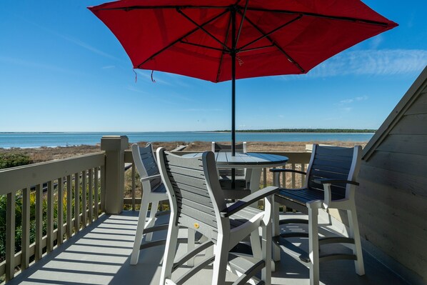 Diese wunderschöne Pelican Watch Villa im 2. Stock ist perfekt! Die Villa ist nicht nur makellos, sie wurde gerade komplett renoviert und neu gestaltet, sondern bietet auch einen unglaublichen Panoramablick auf den Fluss Edisto und den Atlantik. Entspannen Sie sich bei einem kühlen Drink am Decktisch und beobachten Sie, wie sich der Himmel in leuchtendes Orange verwandelt, während die Sonne über dem Fluss Edisto untergeht. Setzen Sie sich mit einem guten Buch unter den Regenschirm, während Garnelen- und Segelboote vorbeiziehen. Nehmen Sie sich die Liegestühle und gehen Sie die Hintertreppe vom Deck zur Promenade hinunter, die zum ruhigen Strand direkt vor dieser schönen Villa führt. Diese Pelican Watch liegt nur einen kurzen Spaziergang von den Beach Club-Pools, den Restaurants am Meer, dem Clubhaus und den Golfplätzen von Pelican's Nest entfernt. Diese Villa hat alles!