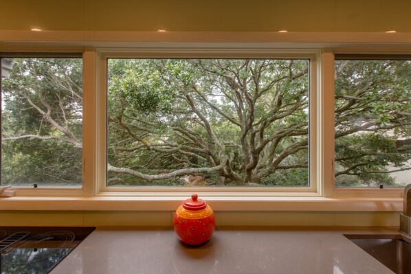 This beach home has undergone extensive renovations and features a reverse floor plan with all the living space on the upper level. The open plan living area has hardwood flooring, a high beamed ceiling, lots of natural light and comfortable seating with a 55” flat screen TV for entertainment. The dining table seats 8 and there are extra bar stools at the quartz bar. The kitchen is completely renovated with and offers a Sub-Zero refrigerator, quartz countertops, custom cabinets, and more cookware, serving pieces, and other great kitchenware than any other home in our inventory. It’s a chef's dream!