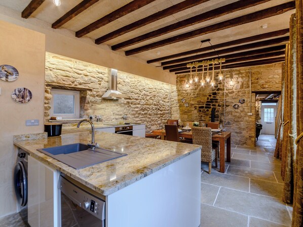 Upstairs is a cosy seating/desk/reading area on the galleried landing and two generously sized bedrooms, both with kingsize beds. One bedroom has an en-suite with walk-in shower whilst the second bedroom has a large separate bathroom, accessed by 5 steps, with a pentagon shower and an original cast iron bath with claw feet. All upstairs rooms have exposed stone walls and original beams. The bedding is crisp white Egyptian cotton from The White Company with new Sleepeezee pocket sprung mattresses. The accommodation is immaculately presented with an eclectic mix of both old and new furniture selected to suit the character of the property.