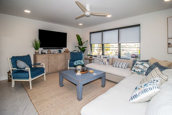 The second floor features elegant white marble flooring throughout. The fully equipped kitchen includes brand-new stainless-steel appliances, a double oven, coffee pot, toaster, and a full-size refrigerator. The inviting living room boasts a 65" TV and a stylish double-sided fireplace. This floor also includes a queen bedroom with ample closet space and a full bathroom with a tub and stocked linen closet.