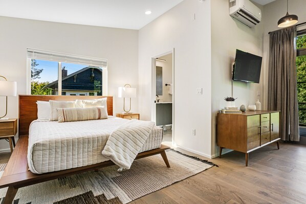 This contemporary studio is located above the garage on a piece of property that it shares with a main home. It has its own private entrance and its own deck with a lovely view of the surrounding greenery. Enter through the glass deck doors, which create a wonderful indoor/outdoor living space that lets in the afternoon breezes and an abundance of natural light. To one side of the room is a sleek kitchenette with streamlined modern cabinetry and necessities that include a refrigerator, a microwave, and a Keurig coffee maker. There's also a glass-top dining table for two, a flatscreen TV with Roku streaming capability, and free WiFi throughout the studio to keep you connected.