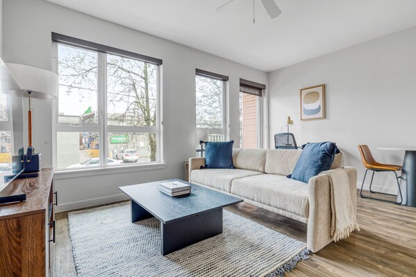 As with any Blueground apartment, you’ll find a thoughtfully designed space complete with beautiful furniture and a fully equipped kitchen in this one bedroom property. And, thanks to our superior quality mattresses, fully stocked linens, and towels, you can relax knowing you’ll always feel comfortably at home. When you’re ready for some fun, you can take in the Seattle vibes or bring the entertainment to you with the premium wireless speaker or smart TV. This apartment also offers in-apartment laundry.