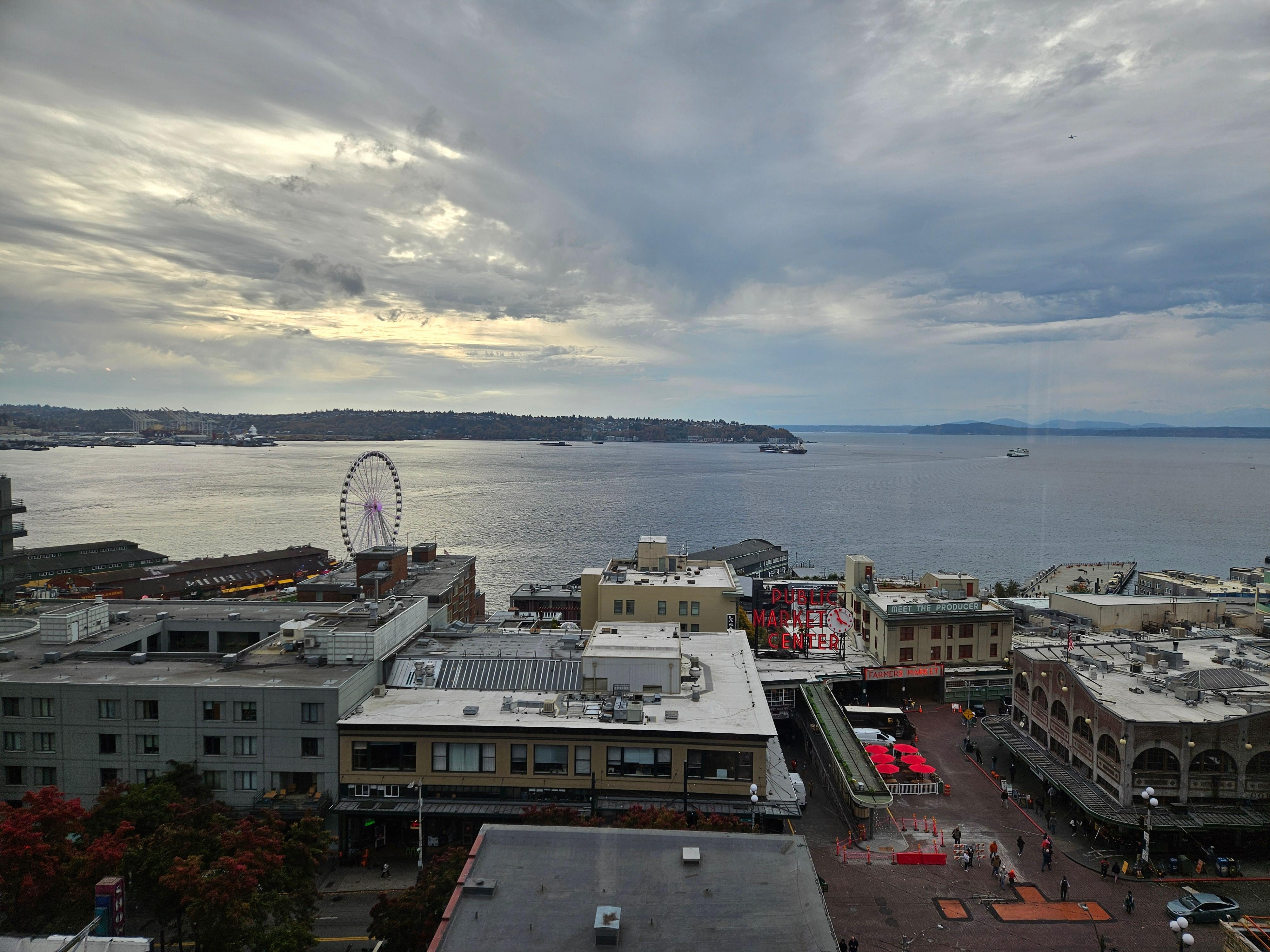 Enjoy breathtaking and postcard views of Elliot Bay, the Great Wheel, and the Olympic Mountains!