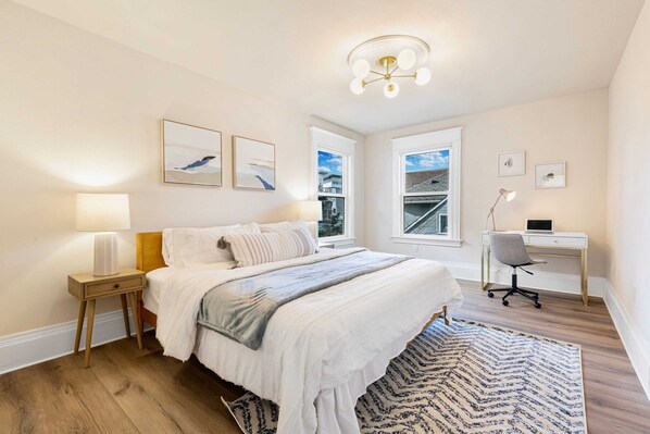 - Master Bedroom with 1 King bed, closet w/hangers, and blackout curtain.