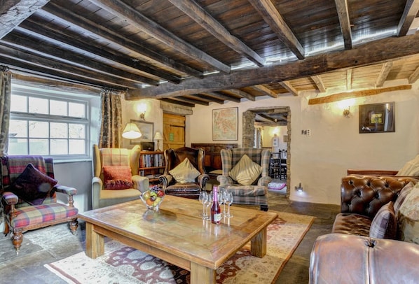 Chock-full of original features, this magnificent country home ticks all the boxes for character and comfort. Its beamed ceilings, exposed stone walls and deep-set windows are complemented by underfloor heating and a high-end kitchen with a colourful electric AGA. Step inside and you’ll find a lounge you’ll want to linger in; a multi-fuel stove, comfortable seating and magnificent ceiling set the scene for companionable evenings in front of the TV or listening to your favourite music. When it’s time to cook, the kitchen is equally quirky with stone walls and flooring, a Butler sink and electric AGA. There’s a small dining table here where four can chat while keeping an eye on what’s cooking, and when dinner is ready to be served, move into the dining room where there’s a beautiful antique table and chairs before a feature stone fireplace. A utility room houses an upright fridge and a washing machine completing the ground-floor layout is a peaceful double bedroom with sofa, an en-suite wet room and doors onto the front patio. A wooden staircase from the ground floor leads to a games room complete with a pool table, table-top football, a TV and a music system. A small double sofa bed turns this into a bedroom for two, with a shower room for added convenience. A second, stone staircase to the first floor gives access to a stunning king-sized room with a gorgeous sleigh-style bed and sofa plus an en-suite with a spa bath and separate shower. Also, there is a twin bedroom and a separate bathroom. Beautiful countryside surrounds the property, with sheep grazing the neighbouring fields and the grounds giving access to the river and stream close by. There is an enclosed rear terrace while the rest of the garden blends harmoniously with the landscape.