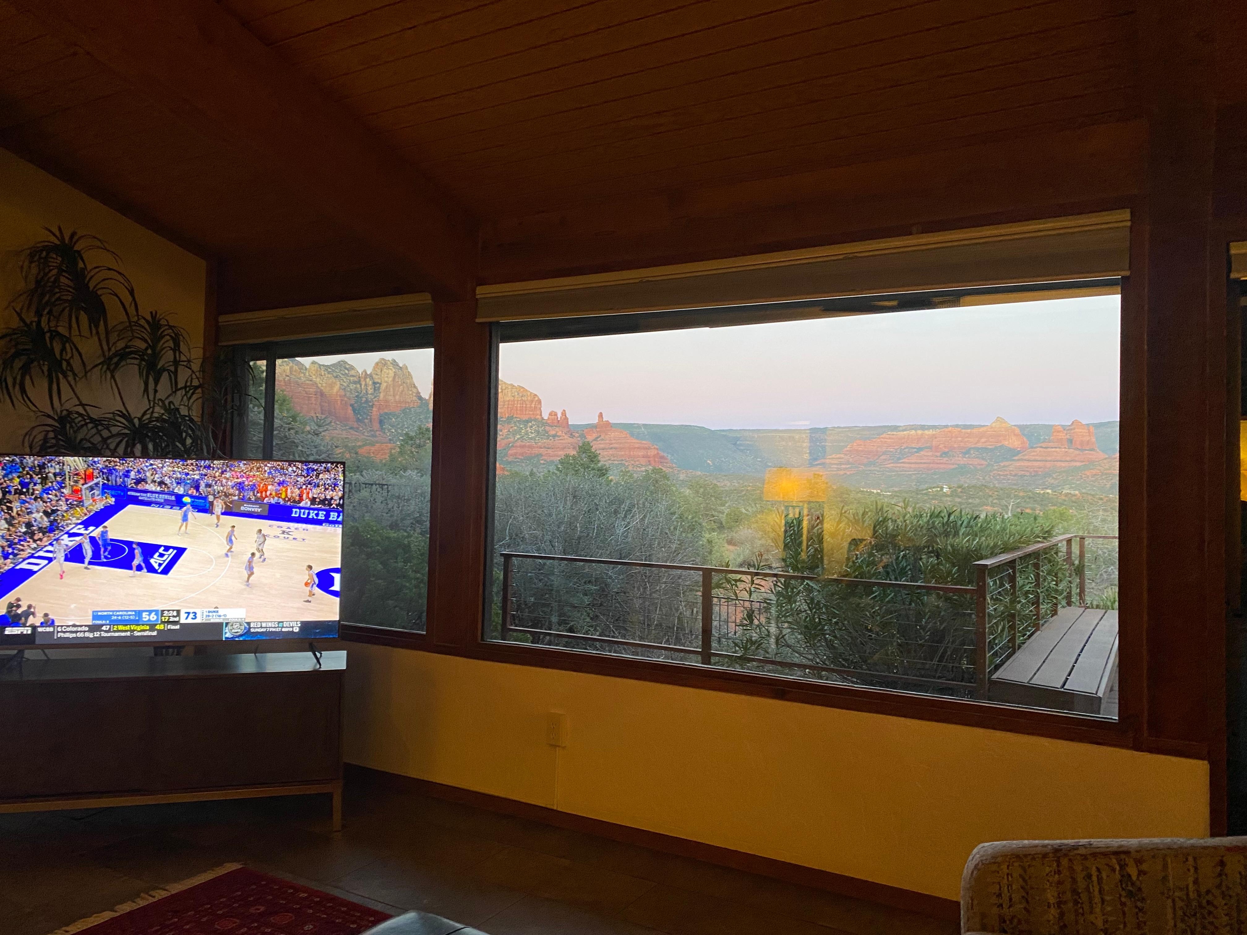 Living Room: The main living area boasts a vaulted ceiling, and a window wall facing east, offering unparalleled views of the valley, forest, and famous rock formations such as; Wilson Mountain, Teapot, Ship Rock, The Fin, and more.. Step out onto the elevated deck, where you can take in the morning sun as it rises over the Mogollon Rim.
