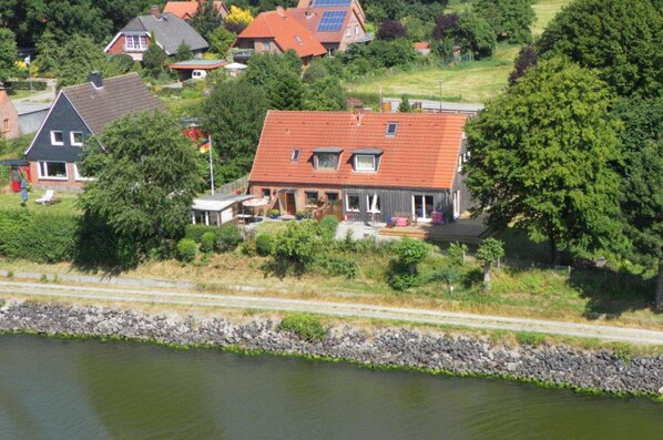 Das Ferienhaus liegt am Nord-Ostsee-Kanal und hat direkten Kanalblick. Vom Haus und der Terrasse aus hat man auch einen Blick auf die alte Eider, die unterhalb des Grundstücks in den Kanal fließt.