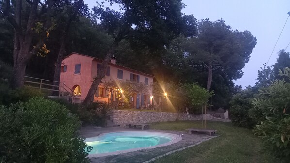 Draußen profitieren Sie von einem großen, bewaldeten Grundstück von über 3000 m2, das nicht zu übersehen ist, mit freiem Blick auf die Hügel, seiner großen, schattigen Terrasse mit Kiefern und Eichen und Olivenbäumen, seinem Grill und seinem Swimmingpool. während gebogen.