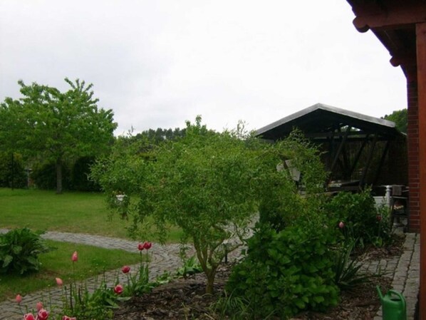 Das großzügige Grundstück mit gemütlicher Sitzecke und Grillplatz lädt zum Verweilen ein.